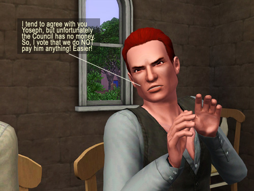 Then Yoseph Y. Hedgewall reported the Maccaroni Bank situation, and it turned out that the total of the loans is smaller, but on fewer hands. 3 households even owed more than the §10.000 limit. Archie Greench owes §13.317, LaShawn Greench owes §17.328 and Alfonso Blumington owes shocking §26.450! How could that happen? Archie, sitting there, turned red (well, a mix of green and red), and said they would solve it within 3 simdays. He couldn't speak for his brother LaShawn, though. And nobody knew about Alfonso Blumington, so Yoseph was told to visit the Blumington house tomorrow.